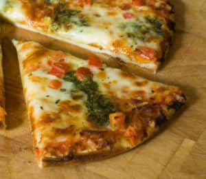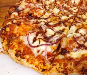Classic Margherita Pizza Fresh hand press cut roma tomatoes sprinkled with fresh Garlic drizzled with extra virgin olive oil And garnished with basil. Fresh red onions carmelized with hickory smoked bbq over grilled chicken breast.
